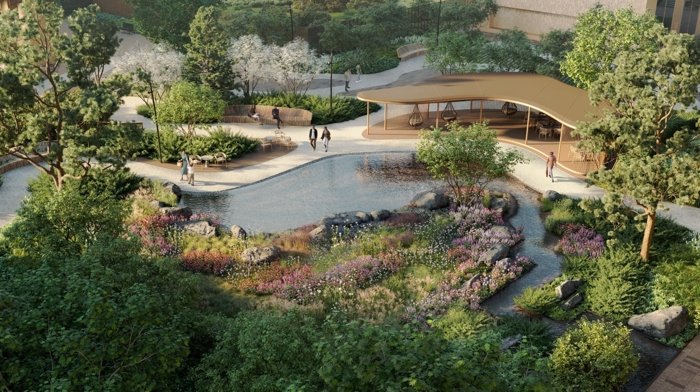 Квартал расположен в собственном огромном дворе-парке площадью 1,8 гектара, закрытом для посторонних. Многоярусное пышное озеленение, цветники и высокие деревья подобраны так, чтобы пространство радовало глаз в любое время года.