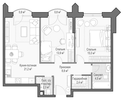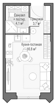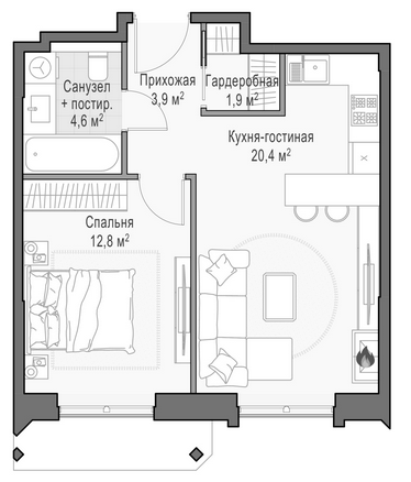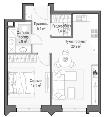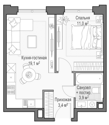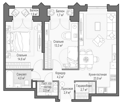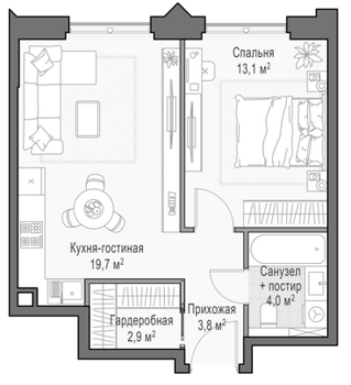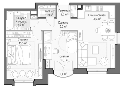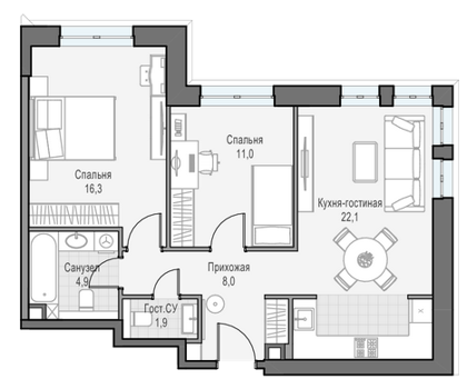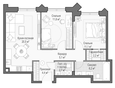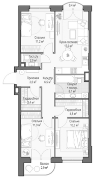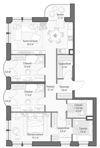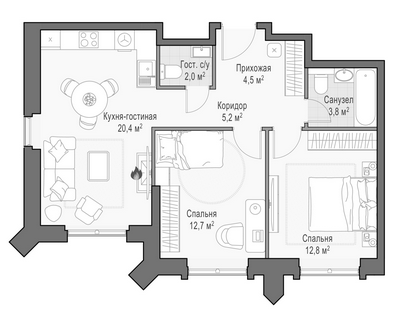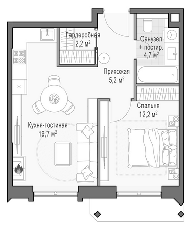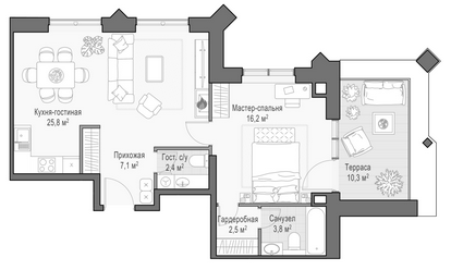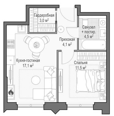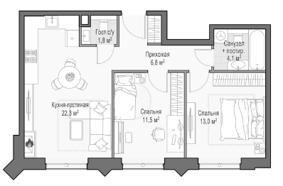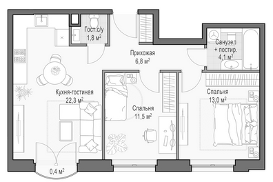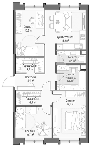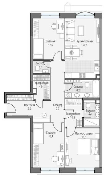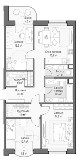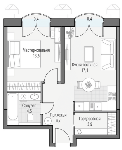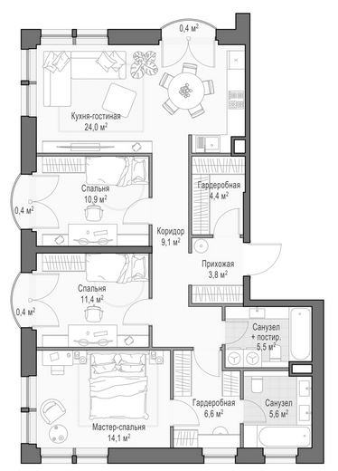 Приветная мастер-спальня, большая кухня-гостиная, удобная прихожая и минимум коридоров.